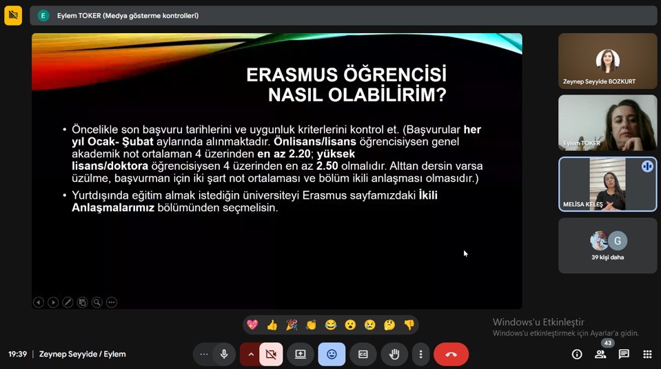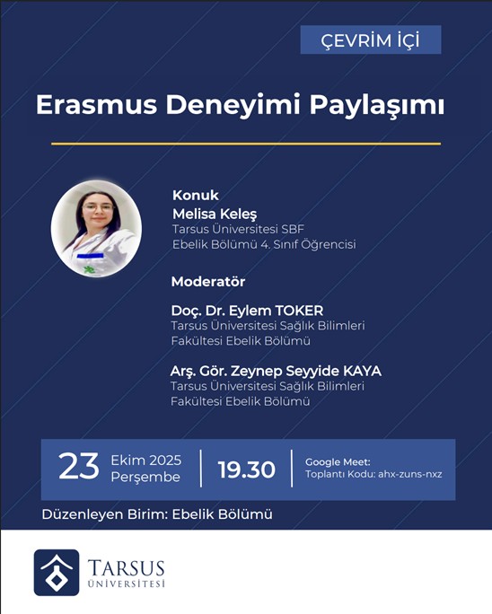Fakültemiz Ebelik Bölümü tarafından 23 Ekim 2025 tarihinde “Erasmus Deneyim Paylaşımı” konulu bir webinar düzenlenmiştir. Etkinlikte, Ebelik Bölümü 4. sınıf öğrencisi Melisa Keleş, Erasmus+ öğrenci hareketliliği kapsamında edindiği eğitim ve kültürel deneyimlerini paylaşmış, süreçle ilgili bilgi vererek katılımcıların sorularını yanıtlamıştır. Etkinlik, öğrencilerde uluslararası hareketlilik programlarına yönelik farkındalık ve motivasyonun artmasına katkı sağlamıştır.