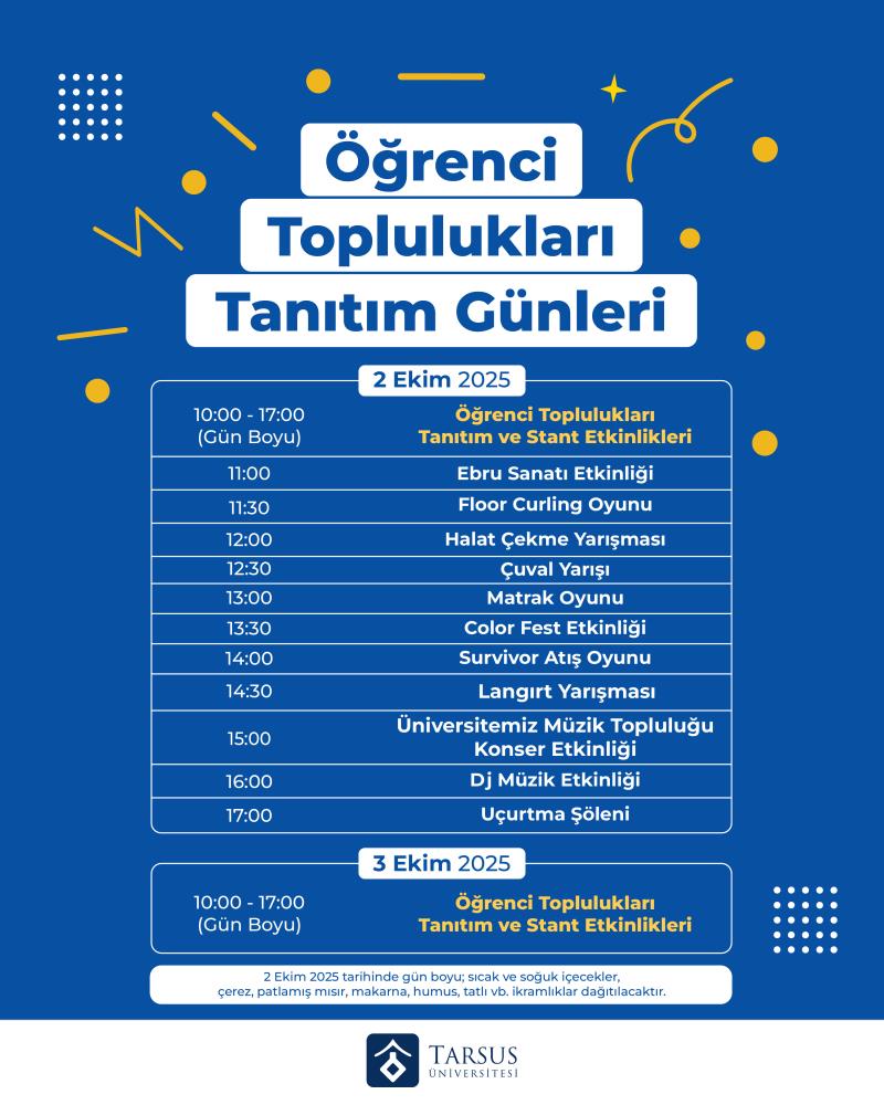 Üniversitemiz Öğrenci Toplulukları; sizlerle tanışmak, faaliyetlerini anlatmak ve üye kaydı almak amacıyla 2 - 3 Ekim 2025 tarihlerinde Merkez Kampüs bahçesinde tanıtım günleri düzenleyecektir.